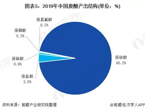 廢硫酸為主要主要廢酸產(chǎn)出種類,2019年,廢硫酸產(chǎn)出量為9020萬噸左右,占廢酸產(chǎn)出量的95.2%。